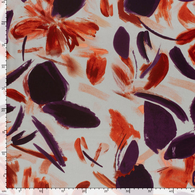 Immergetevi in un mondo di eleganza con il nostro raffinato raso di poliestere Flowers aubergine. Questo tessuto moda di alta qualità colpisce per il suo disegno artistico paisley e floreale in una sofisticata combinazione di colori: melanzana intenso, verde oliva caldo e morbide tonalità della terra.