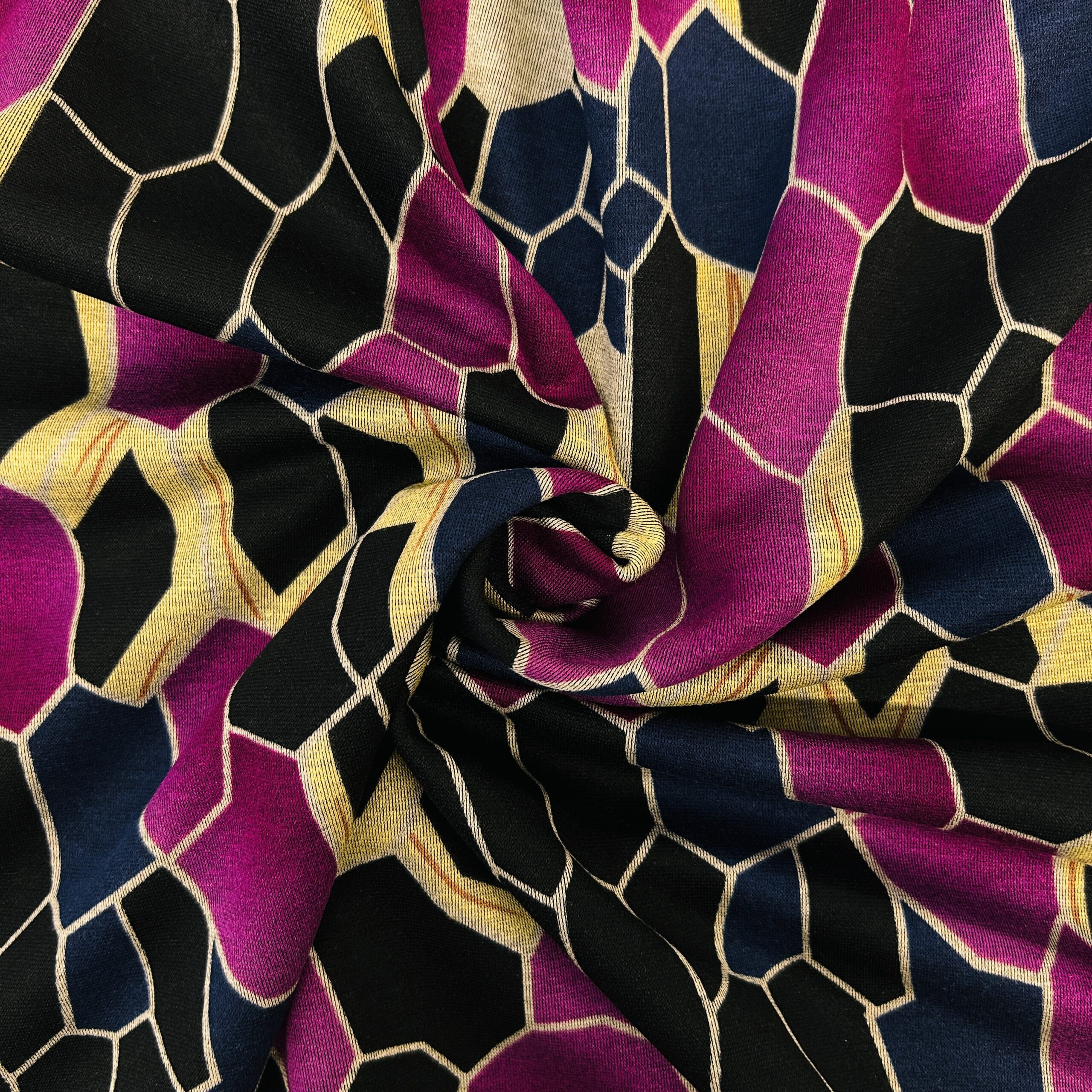 Cucite una moda espressiva e di facile manutenzione con il nostro jersey di viscosa poliestere ”Abstract Mosaic”. Il motivo dinamico e astratto è costituito da forme irregolari interconnesse che ricordano un mosaico moderno o una lastra di vetro colorata. La combinazione di colori tra il fucsia acceso (rosa/viola forte) e i toni caldi del beige/oro (sfondo o contorni) è un’attrazione garantita.