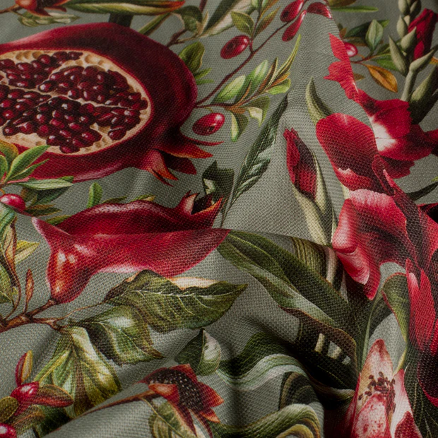 Questo tessuto combina una sensazione naturale con la massima qualità di stampa. Il motivo del melograno appare quasi tridimensionale grazie alla stampa digitale e porta colori vivaci nelle vostre stanze.
