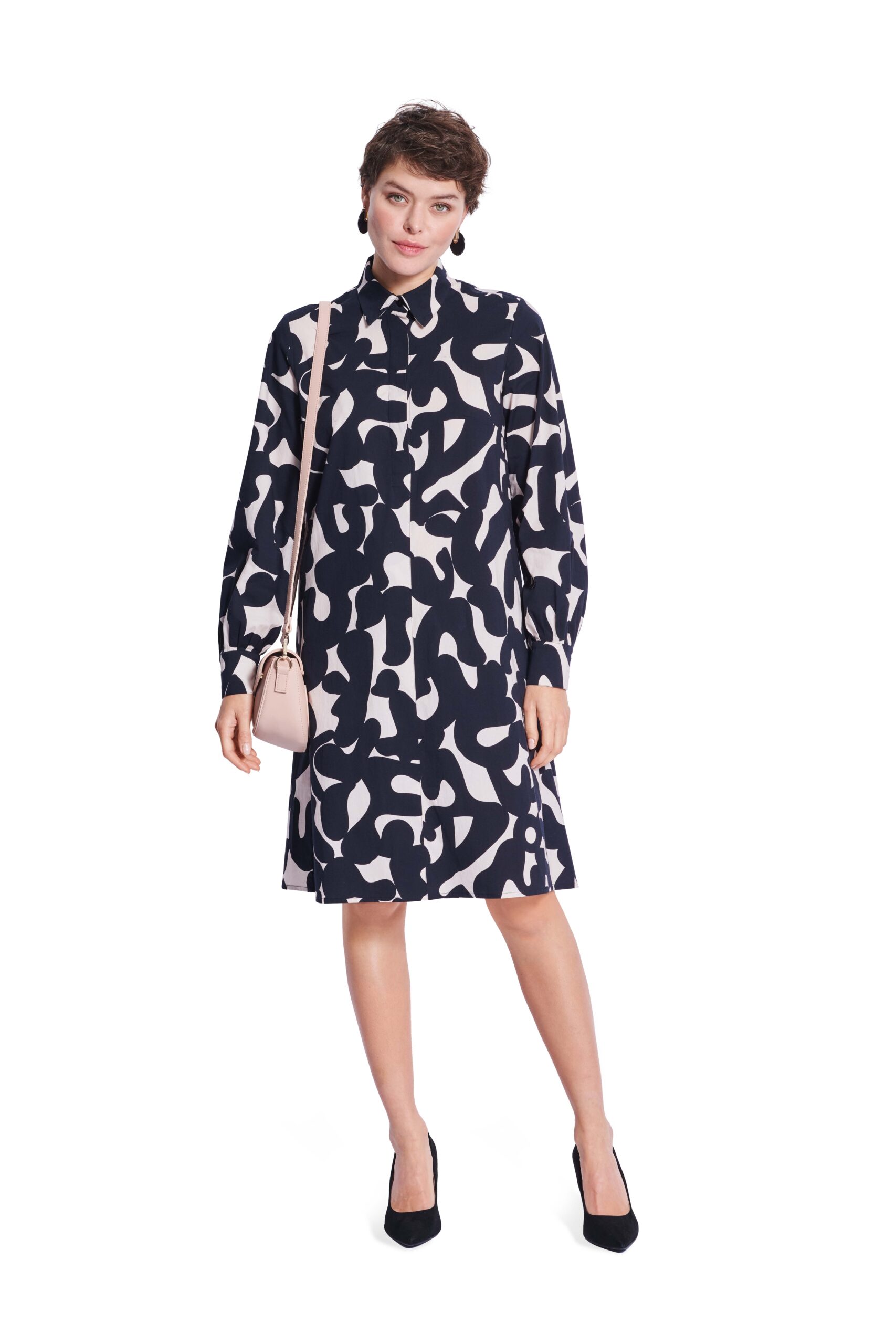 Modell A: Das Kleid hat eine Hemdblusenform, eine durchgehende Knopfleiste und einen eleganten Hemdkragen. Die Ärmel sind locker geschnitten und enden in Manschetten, die mit Knöpfen geschlossen werden.