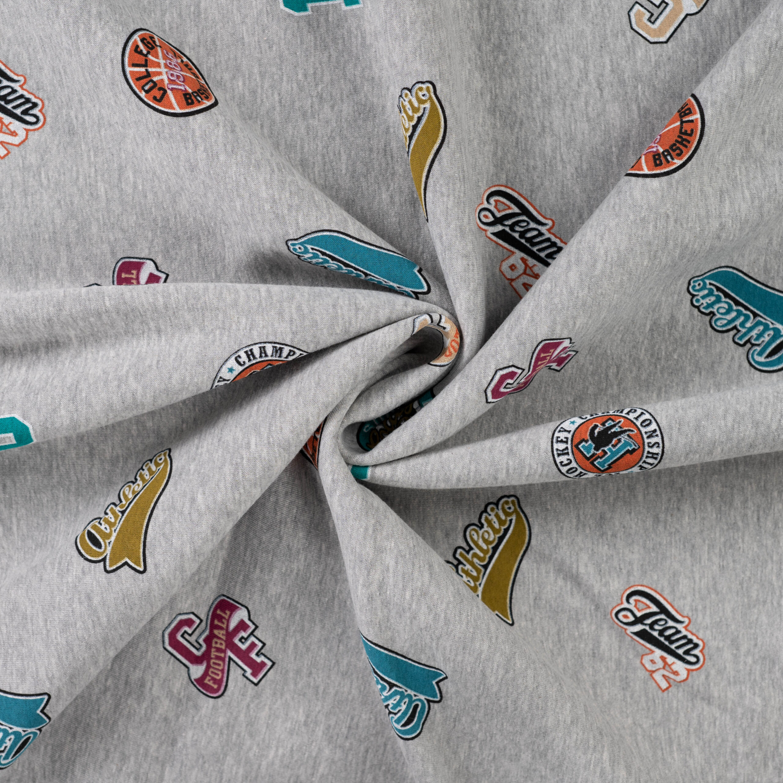 Zeigen Sie Ihren sportlichen Stil mit unserem coolen Joggingstoff “Sport-Logos“ in Melange! Dieser Stoff ist mit verschiedenen grafischen Aufnähern im College- oder Sport-Design bedruckt, die einen dynamischen und trendigen Look erzeugen. Die melierte Optik in Grau macht ihn zu einem vielseitigen Allrounder, der zu allem passt.