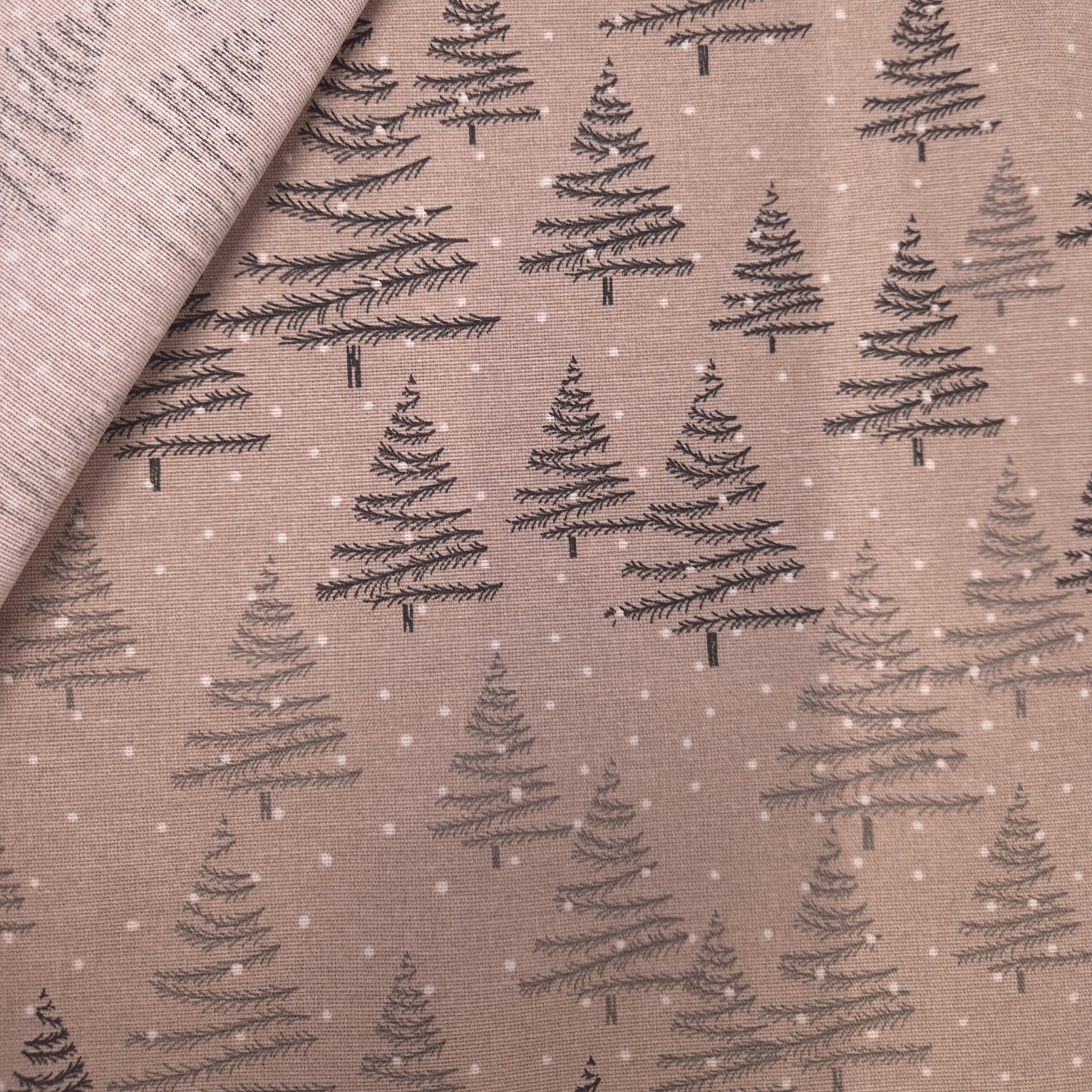 Das Design zeigt stilisierte Tannenbäume, die in einem modernen, fast schon “Picasso-artigen“ oder skizzierten Stil gehalten sind. Die Musterung verleiht dem Stoff einen zeitgenössischen, künstlerischen Look und hebt sich von traditionellen Weihnachtsmotiven ab.